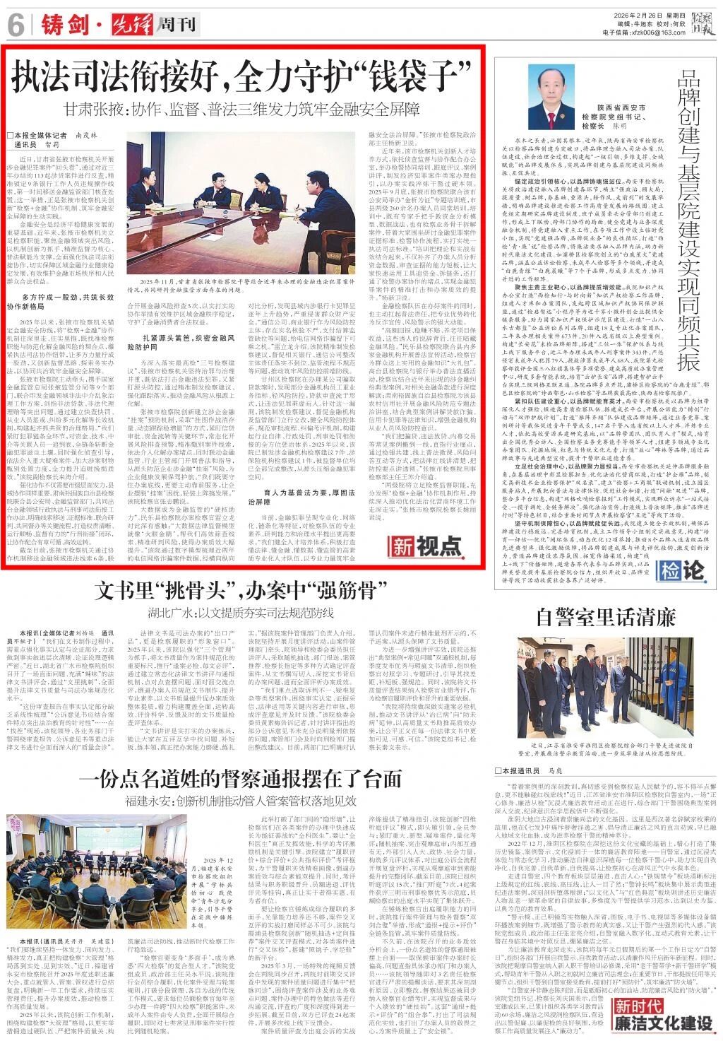 2026年2月26日,检察日报先锋周刊刊发《执法司法衔接好,全力守护“钱袋子” 甘肃张掖:协作、监督、普法三维发力筑牢金融安全屏障》。